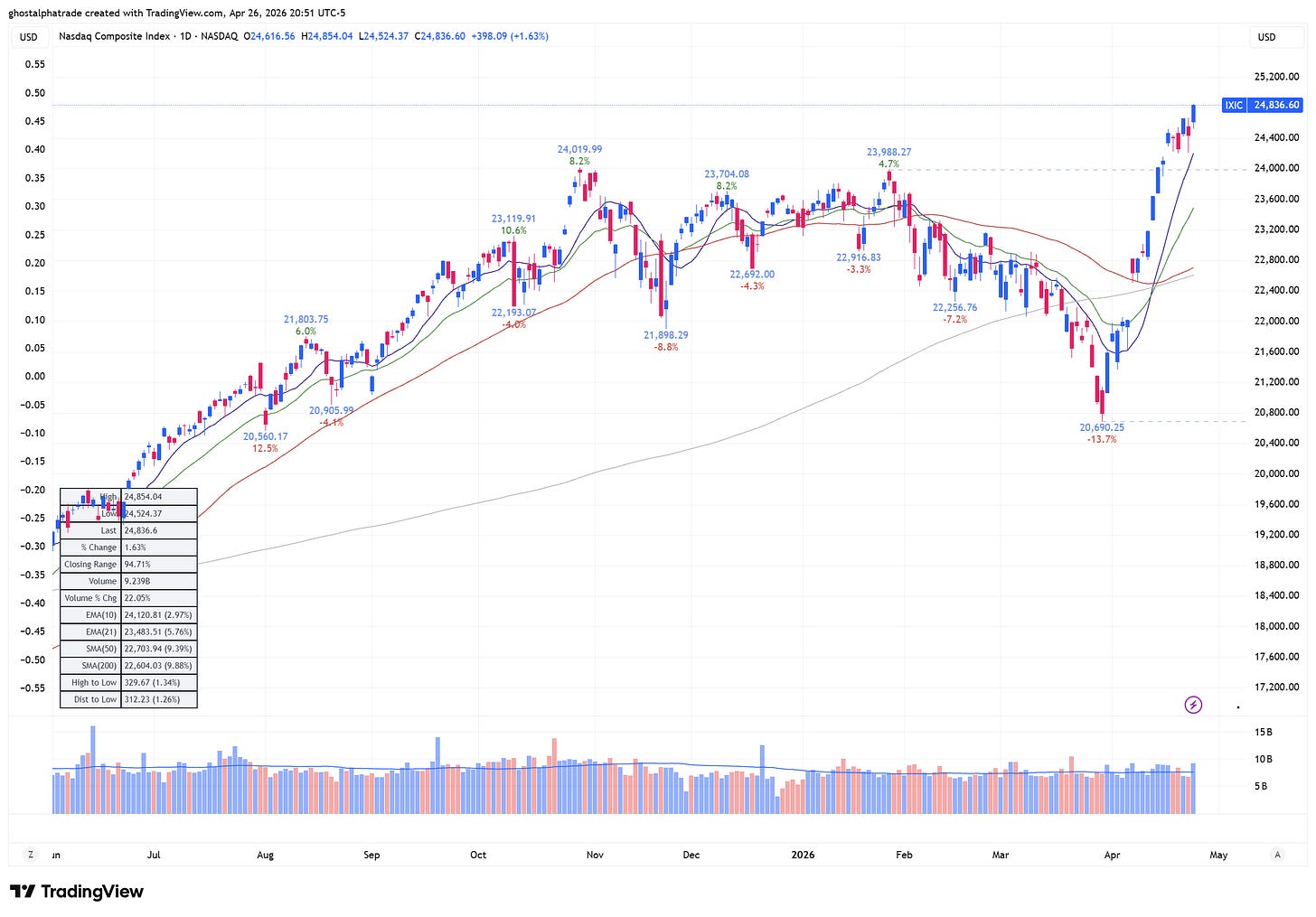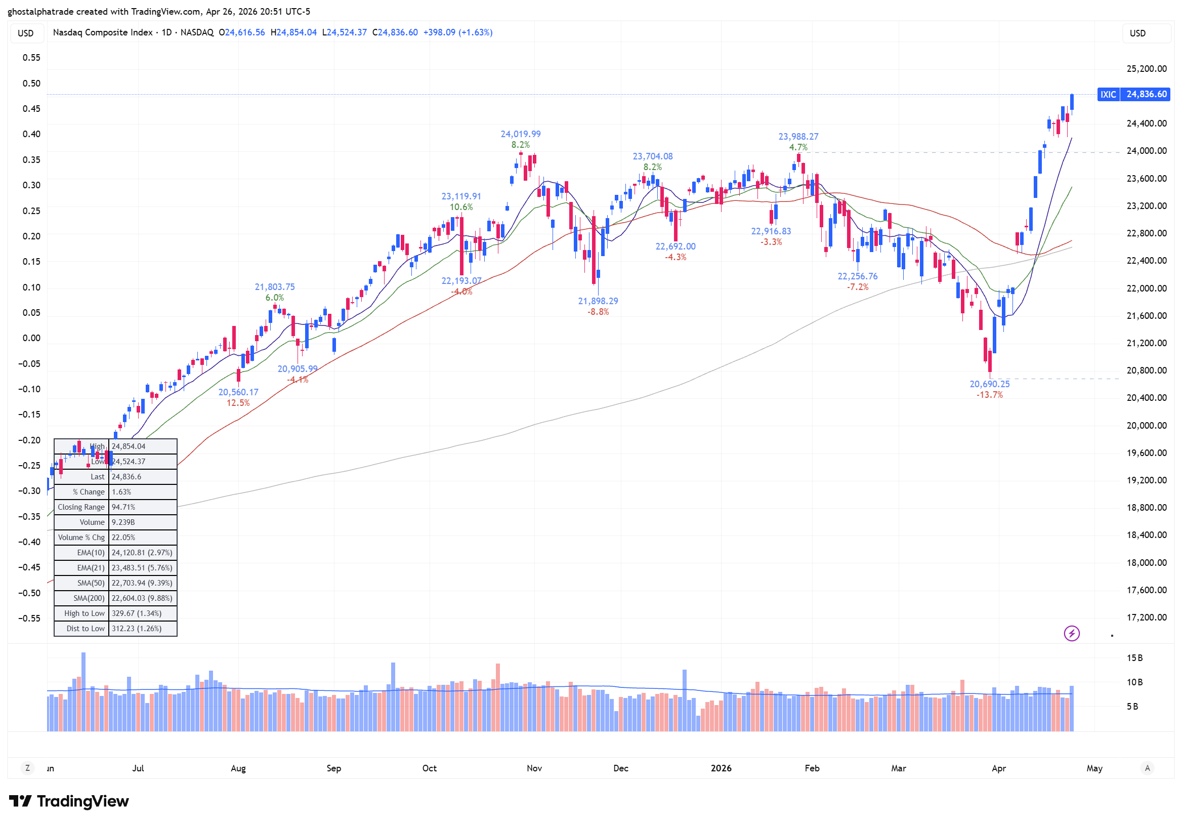 Friday closed strong. Big caps caught up to the rally. Semis have done something I haven’t really seen before. Straight up for weeks, no real digestion, leadership broadening. The Nasdaq engulfed five months of consolidation in eleven trading days. That kind of move doesn’t repeat often, and when it does, the temptation is to chase. The discipline is to…